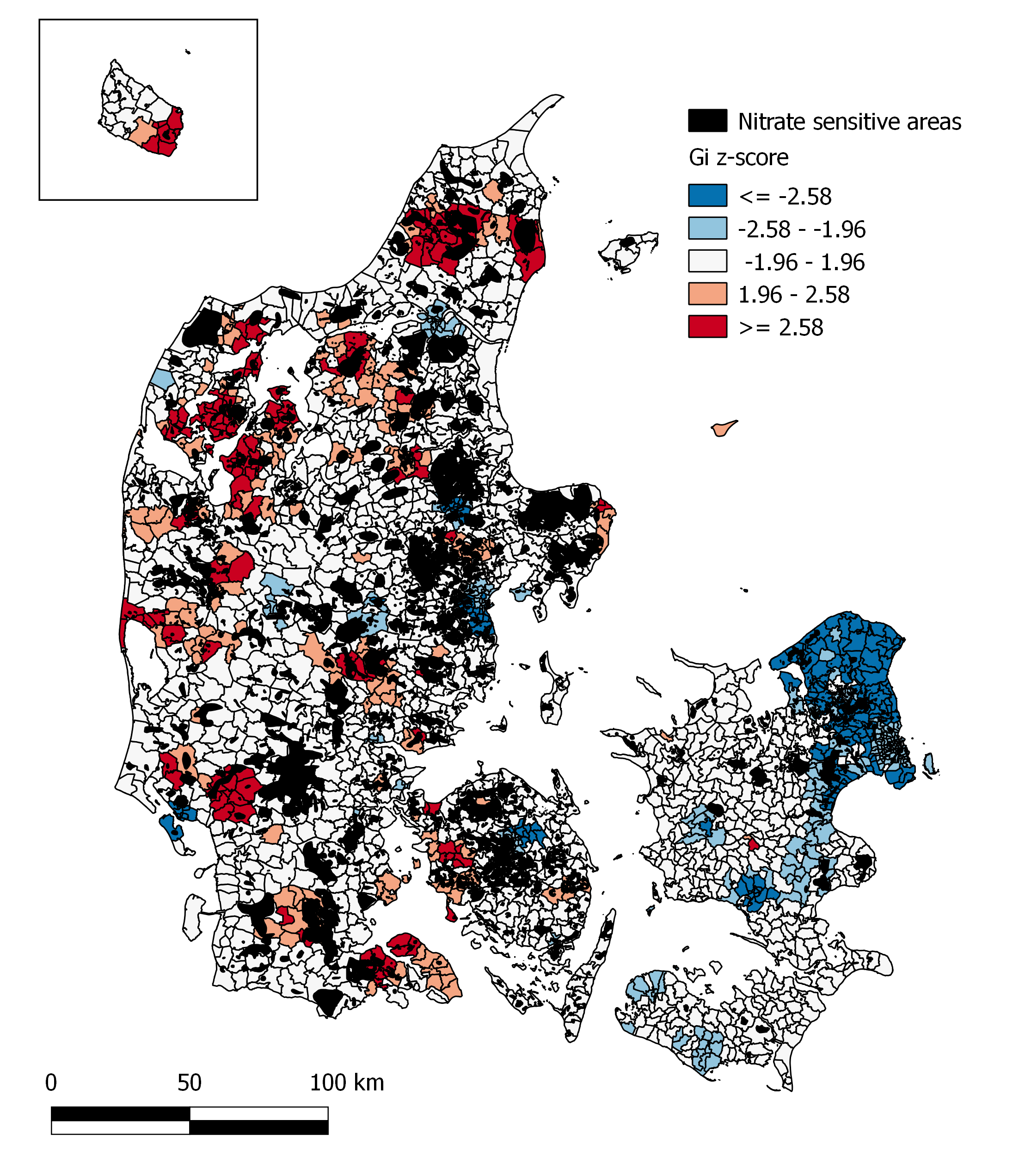 In this paper, we analyze the phosphorus balance as a result of manure application on the parish level for Denmark and investigate its local geographic distribution. For our analysis, we determine phosphorus loads for the five main animal groups and the phosphorus demand of the fifteen major crop categories. Our results show that there is a large variability in the phosphorus balance within Denmark. Due to industry agglomeration, statistically significant hot spots appear mainly along the west coast, while cold spots are predominantly present on the southern and eastern coasts towards the Baltic Sea. As shown in the Figure underneath, the proximity of oversupply areas to water bodies and other environmentally sensitive areas reinforces the need for further phosphorus regulation. Our findings show the importance of a combined spatially targeted regulation, which allows different levels of phosphorus application depending on local economic and environmental circumstances, in combination with subsidizing manure processing technologies in phosphorus hot spots.